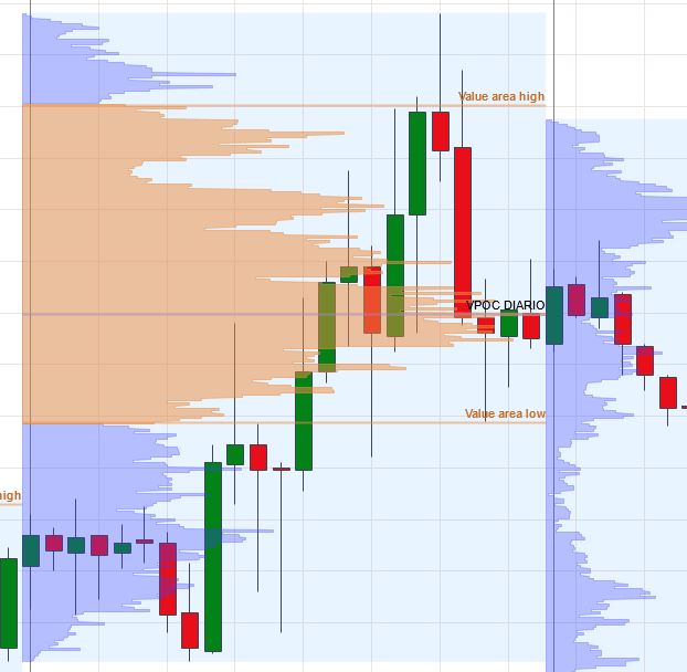 Por otro lado, tenemos una zona llamada “Value Area”, en este caso mostrada en el gráfico como el área naranja, que nos indica el rango de precios en el que se han dado el 70% de los trades (en volumen) de ese periodo. El límite superior se denomina VAH (Value Area High= Máximo del Área de Valor), y el inferior VAL (Value Area Low= Mínimo del Área de Valor).